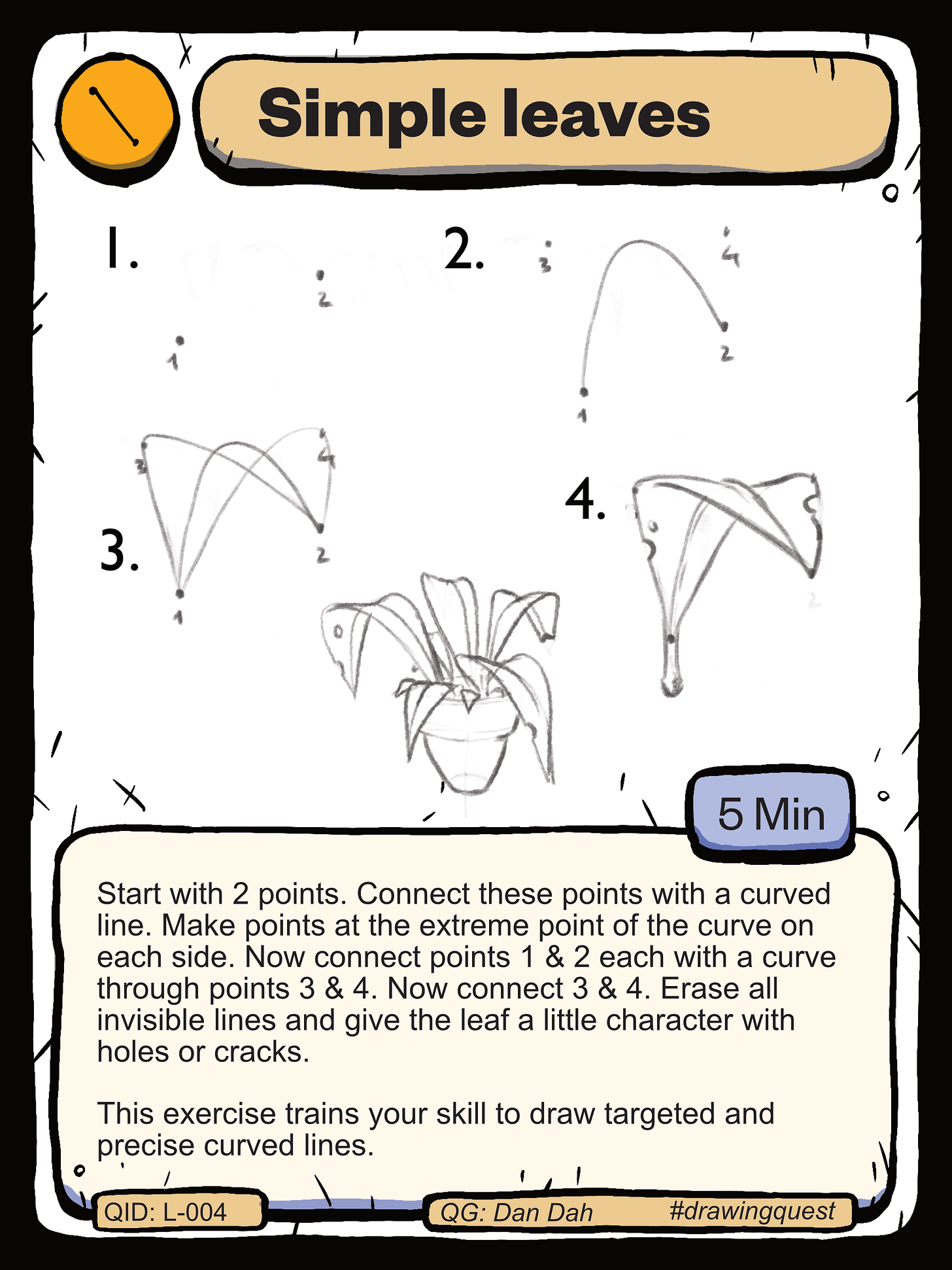 Look, dear guild, the first plants are sprouting, and soon the first blossoms will be radiant towards the sun. The Botanists’ Guild has tasked me with preparing you to perhaps draw more plants for future quests. Therefore, today we’ll look at the basics of plant leaves and, at the same time, practice our ability to draw curves. Have fun!
